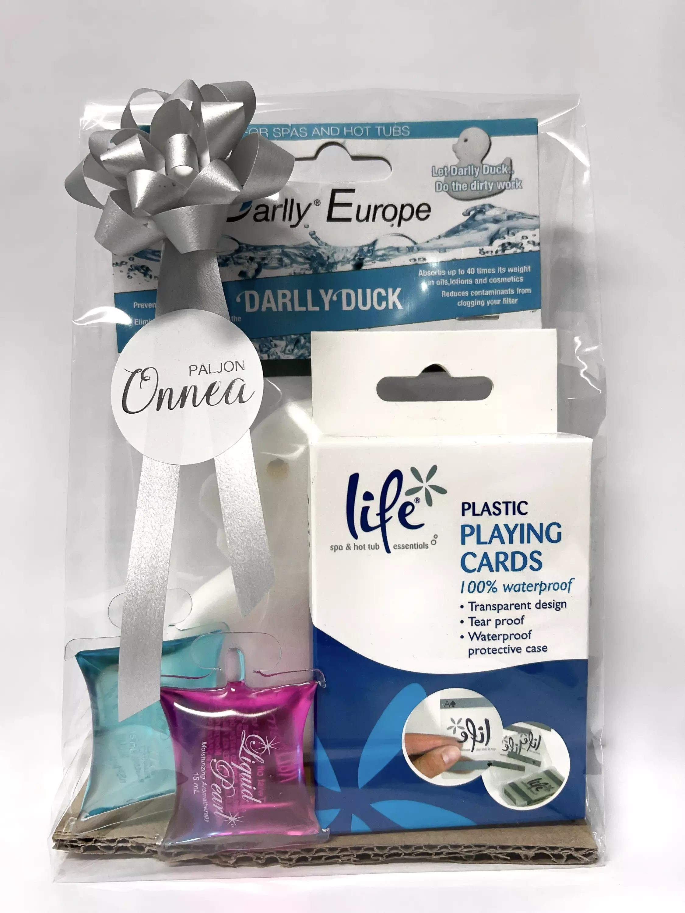 Valmiiksi paketoitu onnittelulahjapaketti ulkoporealtaan omistajalle. Lahjapaketti sisältää vedenkestävät pelikortit, liankerääjä ankan sekä 2 kpl aromaterapia tuoksutyynyjä.