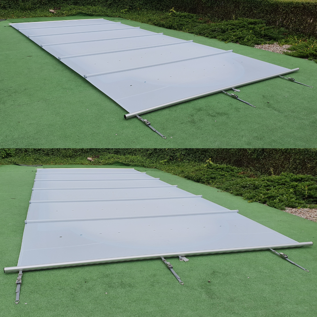 Suojan asentaminen on helppoa ja vaatii vain hieman aikaa ja tarkkuutta. Kiristyslukkojen avulla saat suojan tiukasti kiinnitettyä terassiin, jolloin se pysyy paikallaan koko käyttökauden ajan. PVC-katteet ovat helppoja asentaa sekä lasikuitu- että harkkoaltaisiin. PVC-suojan rullaaminen on helppoa veivin avulla, mutta jos haluat entistä vaivattomamman käyttökokemuksen, suosittelemme sähköistä kelauslaitetta.