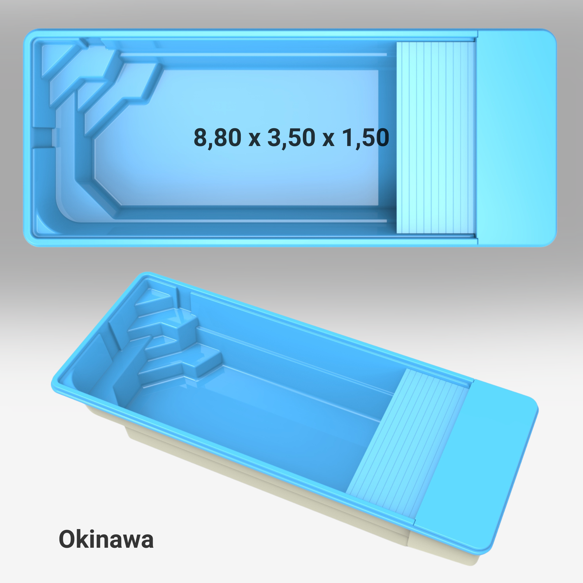 Fortuna Okinawa -uima-allas on yksinkertaisen geometrisen muodon ansiosta selkeän ja modernin näköinen. Altaan koko on 7,80m x 3,20m x 1,5m ja siinä on toisessa päässä mukava pitkä istuin sekä leveät, turvalliset askelmat. Fortuna Mauritius -allasmalli puolestaan tarjoaa hieman enemmän ylellisyyttä ja rentoutumismahdollisuuksia. Altaan koko on suurempi, 8,80m x 3,5m x 1,52m, ja siinä on myös poreistuin.
