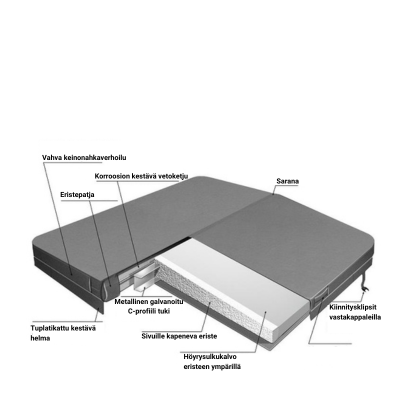 Xtremefrost lämpökannen saranakohdassa sijaitsee erillinen lämpöpatja, joka parantaa kannen lämmöneristystä keskisauman kohdalta – juuri sieltä, mistä lämpö usein muuten pääsisi karkaamaan. Lämpöpatja täyttää saranan mahdollisesti muodostaman raon ja estää tehokkaasti lämpöhäviön. Tämä yksityiskohta tekee kannesta entistä energiatehokkaamman erityisesti kylmissä olosuhteissa. Lämpöpatja on huomaamaton mutta tärkeä osa kannen rakennetta, joka tukee ulkoporealtaan lämmön pysymistä tasaisena ja taloudellisena.